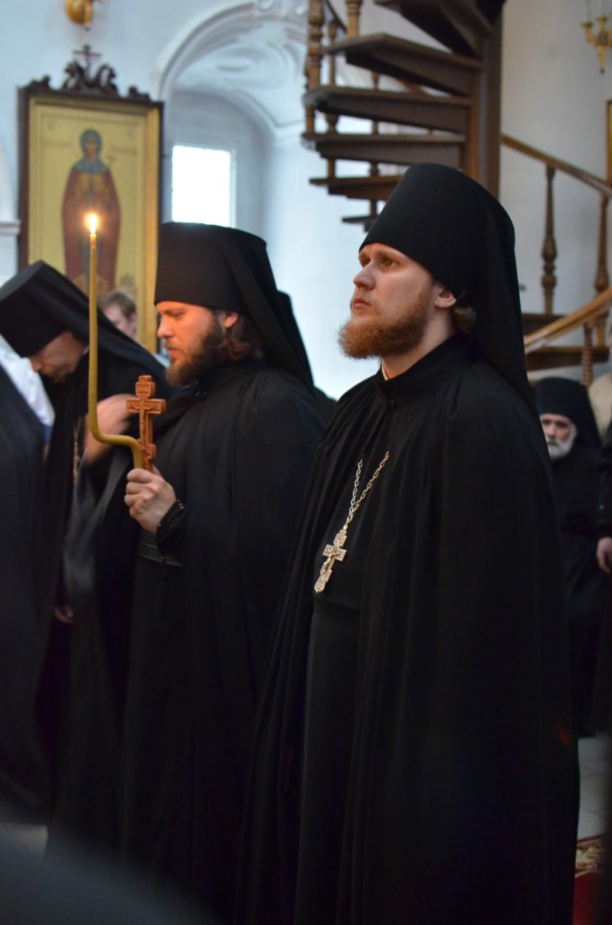 За вечерним уставным богослужением Его Высокопреосвященство совершил чин монашеского пострига. В малую схиму (мантию) был пострижен насельник монастыря послушник Дмитрий (Сандульский) – с наречением имени Никон, в честь преподобного Никона, игумена Радонежского.