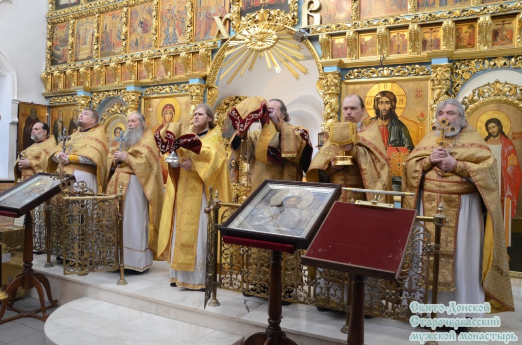 15 октября 2017 года, в Неделю 19-ю по Пятидесятнице, в день памяти Священномученика Киприана и мученицы Иустины исполняющий обязанности наместника Свято-Донского Старочеркасского мужского монастыря иеромонах Сергий (Коломиц) совместно с братией обители в священном сане в монастырском храме Донской иконы Божией Матери совершил Божественную литургию, которую предварил братский молебен с акафистом Пресвятой Богородице пред иконой Ея «Донская». Накануне, 14 октября, было совершено всенощное бдение.
