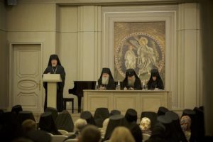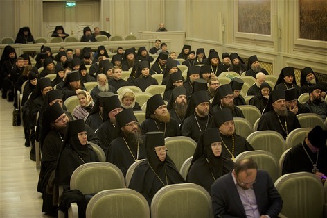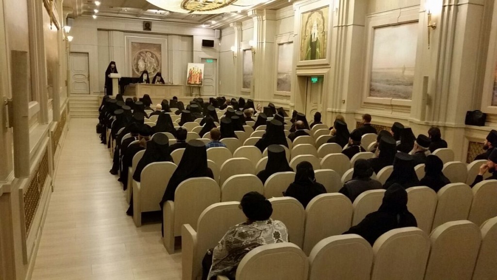 скоп Егорьевский Тихон, наместник Сретенского ставропигиального монастыря, рассказав о 600-летней Сретенской обители, которая одновременно может служить примером древнего и нового монастыря, поскольку в годы богоборчества была практически уничтожена и возрождалась по благословению, молитвам и при всемерной поддержке приснопамятного архимандрита Иоанна (Крестьянкина); Члены Коллегии СОММ – архимандрит Феофилакт (Безукладников), наместник Воскресенского Ново-Иерусалимского ставропигиального мужского монастыря и игумения Елисавета (Позднякова), настоятельница ставропигиального женского монастыря Марфо-Мариинская обитель милосердия, которые в своем докладе сообшили о принципах работы Коллегии СОММ и результатах инспекционных поездок по монастырям Русской Православной Церкви; игумен Петр (Еремеев), наместник Высоко-Петровского ставропигиального мужского монастыря и иеромонах Корнилий (Зайцев) сделали сообщение о создании системы богословского образования монашествующих и познакомили собрание с перечнем предметов для трехгодичного курса обучения; заместитель председателя Синодального отдела по взаимоотношениям Церкви с обществом и СМИ В.В. Кипшидзе выступил на тему «Актуальные вопросы присутствия монастырей в информационном пространстве».; заместитель председателя СОММ, настоятельница Зачатьевского ставропигиального женского монастыря игумения Иулиания (Каледа) сделала сообщение о подготовке к XXVI Международным Рождественским образовательным чтениям, посвященным теме «Нравственные ценности и будущее человечества».; епископ Серпуховской Роман, викарий Московской епархии, благочинный монастырей Московской епархии, в своем выступлении отметил наиболее важные особенности сегодняшней жизни двадцати четырех (12 мужских и 12 женских) монастырей Московской епархии; далее диакон Роман Криницын, руководитель Паломнической службы Высоко-Петровского ставропигиального мужского монастыря, рассказал о здоровом питании и представил продукцию торговой марки Троице-Сергиевой лавры «Сергиев канон».