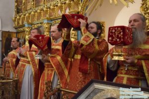 По благословению исполняющего обязанности наместника монастыря соборные богослужения возглавил благочинный обители иеромонах Таврион (Балабанов).