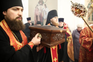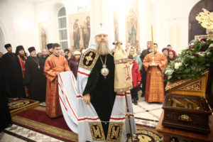 В этот день для поклонения верующим в храм был доставлен ковчег с частицей мощей великомученицы Екатерины, переданный благотворителями в дар приходу.
