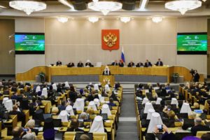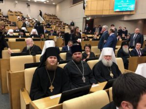 Святейший Патриарх Кирилл и В.В. Володин в сопровождении митрополита Меркурия прошли в зал заседаний Государственной Думы и заняли места в президиуме, где также находились первый заместитель председателя Совета Федерации ФС РФ Н.В. Федоров, заместитель председателя Государственной Думы ФС РФ П.О. Толстой, руководитель фракции «Единая Россия» С.И. Неверов, руководитель фракции ЛДПР в Государственной Думе ФС РФ В.В. Жириновский, руководитель фракции КПРФ в Государственной Думе ФС РФ Г.А. Зюганов, руководитель фракции «Справедливая Россия» в Государственной Думе ФС РФ С.М. Миронов, председатель Комитета Государственной Думы ФС РФ по развитию гражданского общества, вопросам общественных и религиозных объединений С.А. Гаврилов.