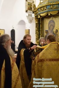 За братским молебном иеромонах Сергий преподал благословение новопоступившему в число братии обители послушнику Алексию (Марфенко) на ношение подрясника, скуфьи и четок.