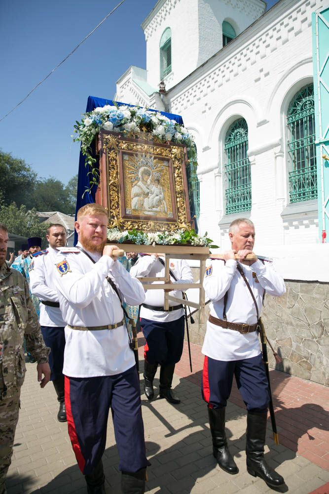 По окончании Божественной литургии верующие во главе со своим архипастырем совершили крестный ход с воссозданной Аксайской иконой Божией Матери, образ которой был принесен на Дон в сентябре прошлого года.