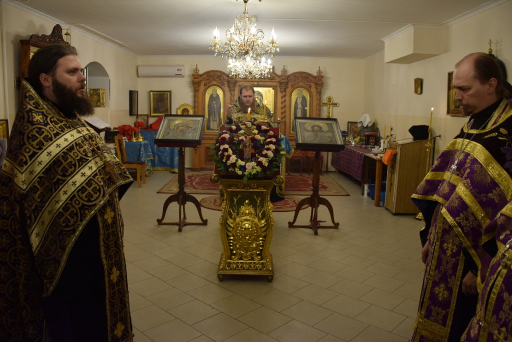 Накануне, 26 сентября, было совершено всенощное бдение с выносом Честного Креста на средину храма для поклонения.