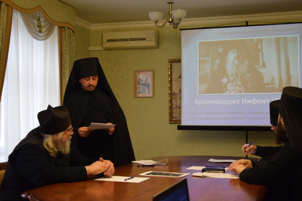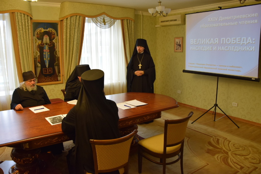 10 ноября 2019 года, в день памяти святителя Димитрия, митрополита Ростовского, в зале заседаний Духовного собора Донского Старочеркасского Ефремовского мужского монастыря, в рамках XXIV Димитриевских образовательных чтений состоялась работа круглого стола на тему: «Защищая Отечество — земное и небесное». Заседание круглого стола, по благословению исполняющего обязанности наместника обители иеромонаха Сергия (Коломиц), приветственным словом открыл благочинный монастыря иеромонах Таврион (Балабанов), который отметил важности исторической памяти предков, их подвигов и доброго примера для современного поколения, в том числе священников и иноков.