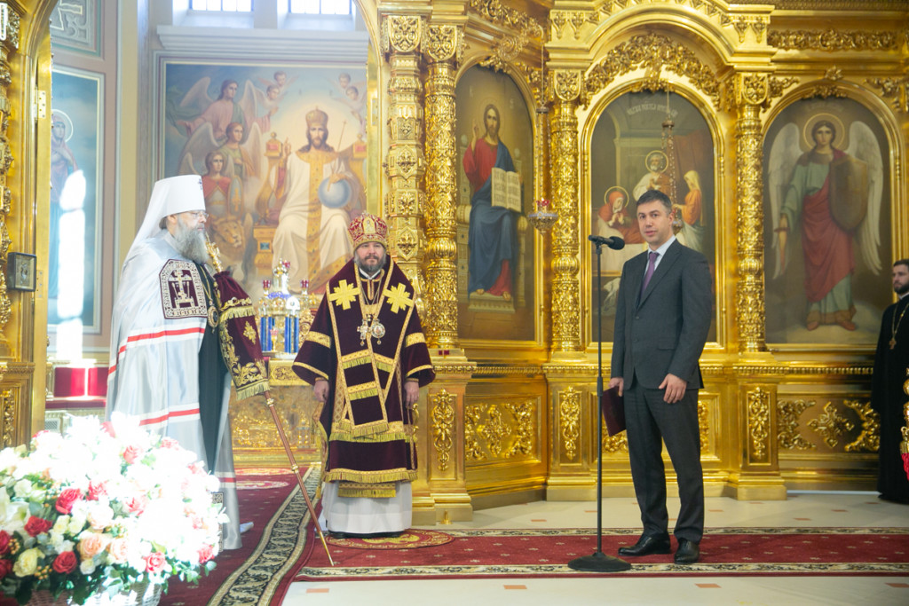 По окончании богослужения епископ Шахтинский и Миллеровский Симон огласил поздравительный адрес Святейшего Патриарха Московского и всея Руси Кирилла митрополиту Меркурию с днем тезоименитства.