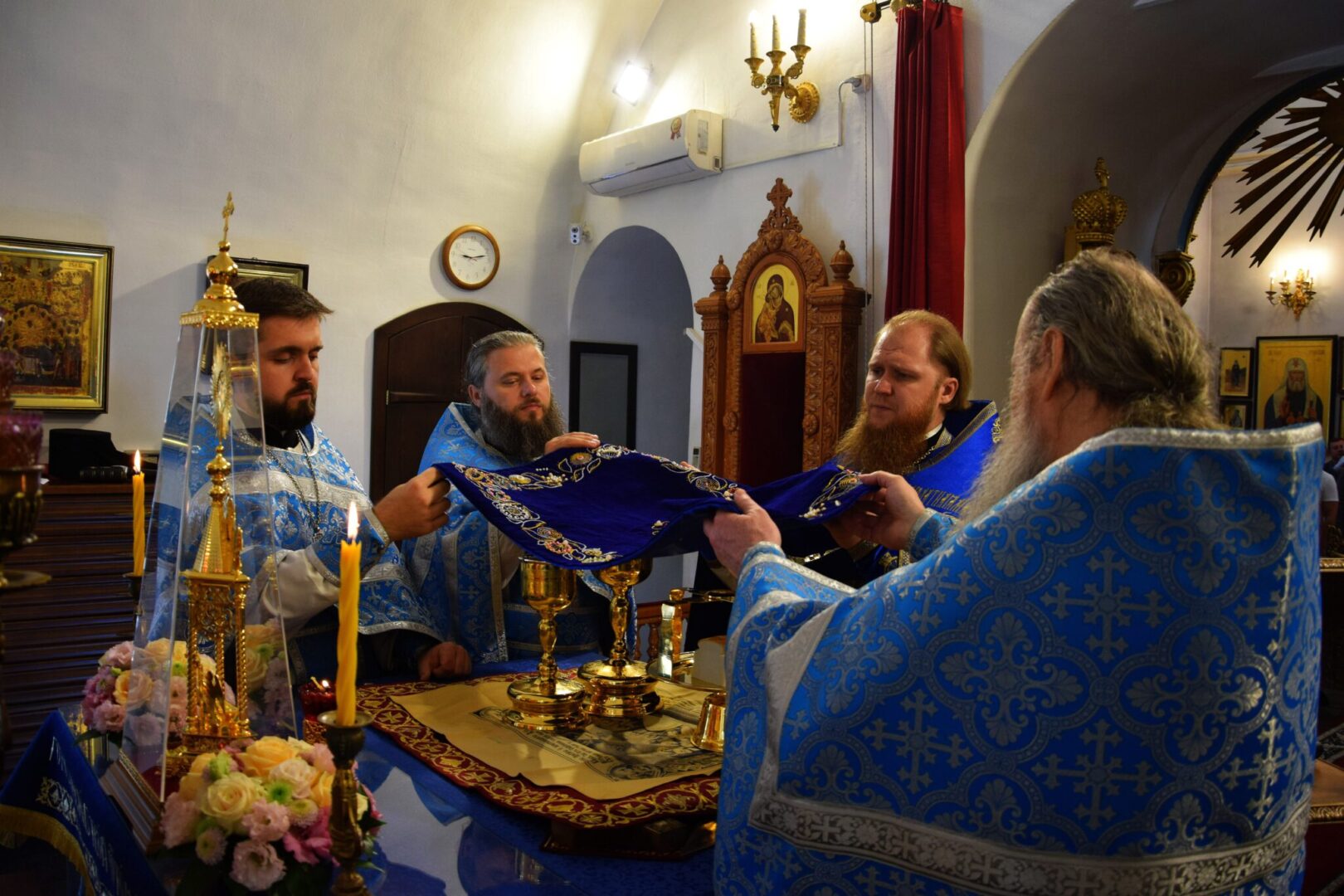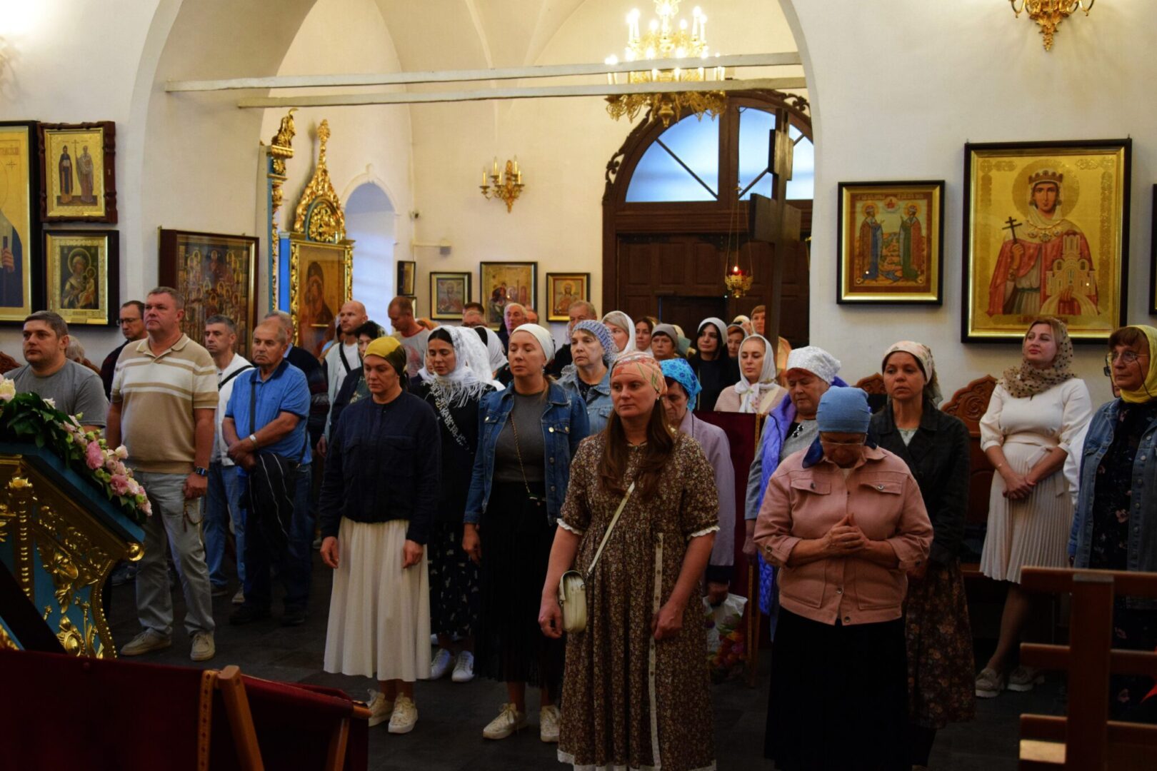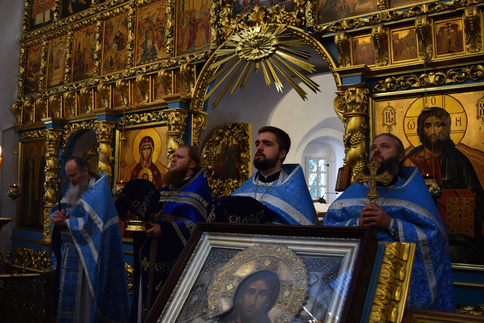 По завершении Литургии отец игумен произнес проповедь, затем был совершен крестный ход внутри обители, братская трапеза и чин о Панагии.