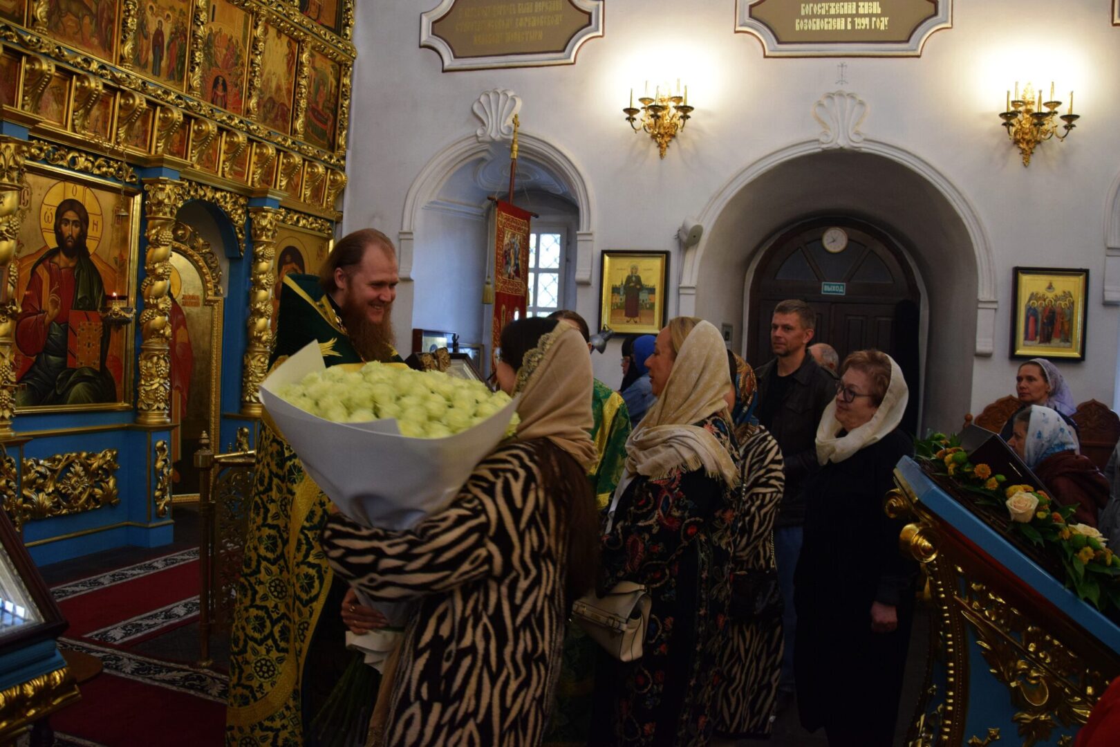 В завершении богослужения благочинный обители иеромонах Никон (Сандульский) от лица братии, сотрудников и паломников монастыря поздравил отца наместника с днем тезоименитства, десятой годовщиной монашеского пострига и диаконской хиротонии и преподнес букет цветов и святую просфору.