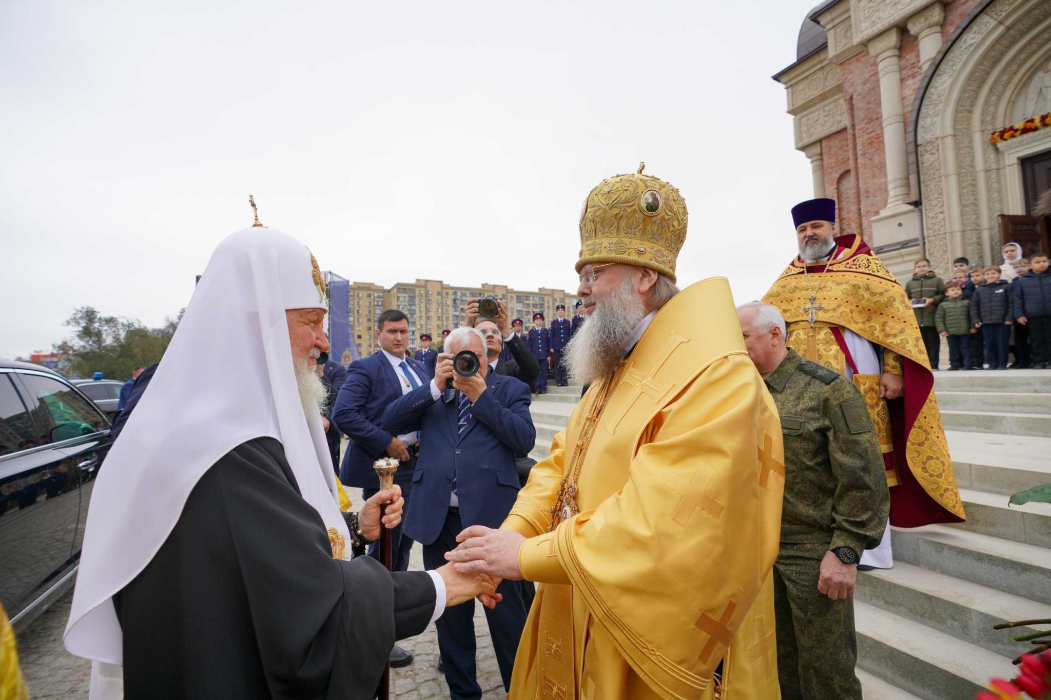 За Литургией Его Святейшеству сослужили: управляющий делами Московской Патриархии митрополит Воскресенский Григорий; митрополит Ростовский и Новочеркасский Меркурий; митрополит Ставропольский и Невинномысский Кирилл, председатель Синодального отдела по взаимодействию с Вооруженными силами и правоохранительными органами, председатель Синодального комитета по взаимодействию с казачеством; митрополит Донецкий и Мариупольский Владимир; епископ Волгодонский и Сальский Антоний; епископ Шахтинский и Миллеровский Симон; епископ Таганрогский Артемий, викарий Ростовской епархии; епископ Раменский Алексий, личный секретарь Святейшего Патриарха Кирилла; протоиерей Иоанн Осяк, секретарь митрополита Ростовского и Новочеркасского по г. Ростову-на-Дону, благочинный Юго-Западного церковного округа г. Ростова-на-Дону; протоиерей Валерий Волощук, настоятель новоосвященного храма, помощник командующего войсками ЮВО по работе с верующими военнослужащими; протоиерей Георгий Сморкалов, настоятель Патриаршего Вознесенского войскового всеказачьего собора г. Новочеркасска Ростовской области, войсковой священник ВКО «Всевеликое войско Донское»; протоиерей Тимофей Фетисов, ректор Донской духовной семинарии, настоятель Троицкого храма г. Таганрога; протоиерей Димитрий Василенков, заместитель председателя Синодального отдела по взаимодействию с Вооруженными силами и правоохранительными органами, главный военный священник духовенства, окормляющий военнослужащих Вооруженных сил России и сотрудников иных силовых структур в зоне проведения СВО; игумен Сергий (Коломиц), наместник Донского Старочеркасского Ефремовского мужского монастыря; иерей Димитрий Болотаев, секретарь епархиального управления Ростовской епархии, настоятель кафедрального собора Рождества Пресвятой Богородицы г. Ростова-на-Дону; иерей Алексий Овчинников, проректор по научной работе Донской духовной семинарии; духовенство г. Москвы и Донской митрополии.