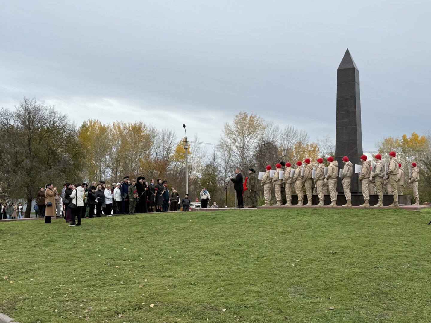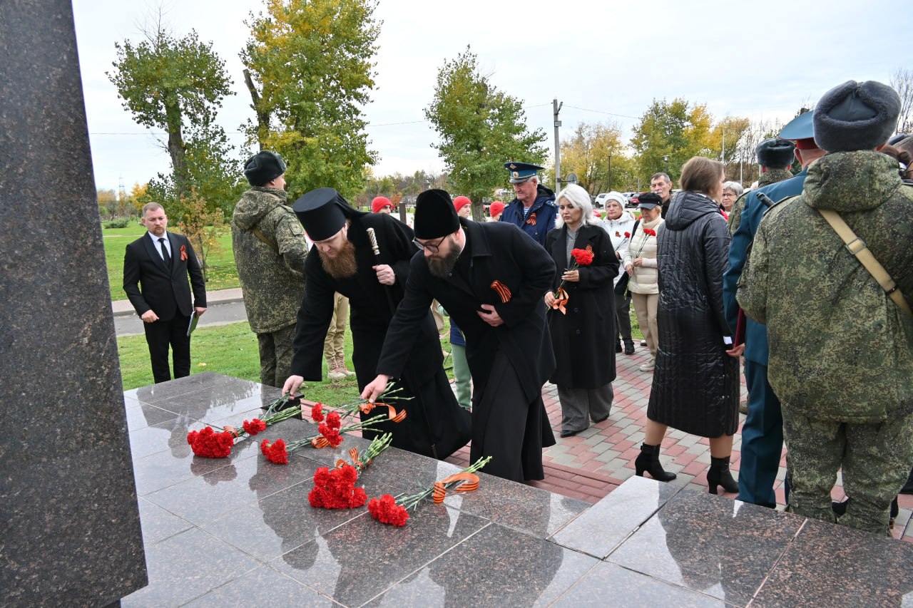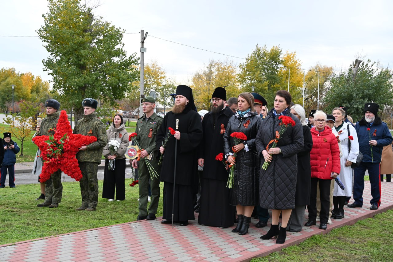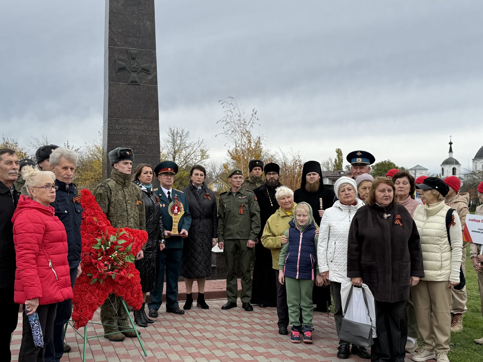 Память героев, павших при защите Отечества, почтили минутой молчания, а затем возложили цветы к обелиску «Станица Старочеркасская – населенный пункт воинской доблести».