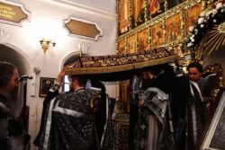 Ефремовского мужского монастыря игумен Сергий (Коломиц) в сослужении братии обители в священном сане совершил вечерню с выносом Святой Плащаницы и малое повечерие с чтением канона (плач Пресвятой Богородицы).